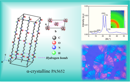 貴大新聞網(wǎng)訊(材料與冶金學(xué)院)近日,我校材料與冶金學(xué)院劉玉飛特聘教授團隊在生物基聚酰胺材料研究領(lǐng)域取得重要突破,相關(guān)成果以 Biobased Polyamide 5652 with α?Crystal Form: Characterization and Low Moisture Absorption為題,發(fā)表于高分子領(lǐng)域頂級期刊Macromolecules(自然指數(shù)期刊,中科院一區(qū)TOP)。貴州大學(xué)材料與冶金學(xué)院為論文第一完成單位,材料與冶金學(xué)院2022級碩士研究生王艷平為第一作者,劉玉飛特聘教授為通訊作者。近年來,生物基聚酰胺56(PA56)因其原料可再生、低碳環(huán)保而備受關(guān)注,但其特殊的分子結(jié)構(gòu)(戊二胺單元含奇數(shù)碳原子)導(dǎo)致其晶體通常以γ晶型為主,飽和吸水率高達(dá)12%以上,在潮濕環(huán)境中力學(xué)性能顯著下降(如拉伸強度降低20%-30%),嚴(yán)重限制了在精密工程領(lǐng)域的應(yīng)用,而傳統(tǒng)改性方法往往以犧牲材料其他性能為代價。針對這一難題,劉玉飛特聘教授創(chuàng)新性地提出了雙氫鍵結(jié)構(gòu)調(diào)控策略:自主合成關(guān)鍵單體,設(shè)計并成功合成新型565二胺單體(C16H34N4O2),將565二胺與草酸二丁酯通過溶液聚合及